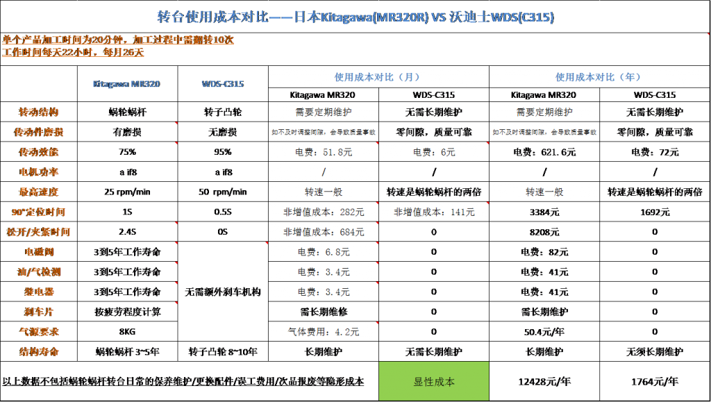 汽車(chē)配件行業(yè)一位客戶(hù)在試用沃迪士WDS-C315型號時(shí)將沃迪士第四軸產(chǎn)品與其原有的日本北川Kitagawa MR320R型號性能進(jìn)行了跟蹤和記錄,測試詳細結果如下表。沃迪士數控回轉臺以其獨特的滾子凸輪結構在轉速、傳動(dòng)效率和維護成本上展現了明顯的優(yōu)勢。