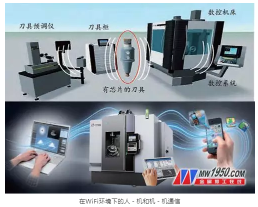 從圖中可見(jiàn),不僅人機的交互方式從控制面板延伸到移動(dòng)終端,設備和工具之間也可以進(jìn)行物與物的通信。機床的加工精度和效率在很大程度上取決于刀具的狀態(tài),如果在刀具或刀柄上嵌入芯片,就成為智能刀具。芯片不僅可以記錄在刀具預調儀上進(jìn)行調整時(shí)的數據,還可以記錄刀具在機床進(jìn)行了多長(cháng)的切削時(shí)間,還有多少剩余壽命,可以加工幾個(gè)零件等都可以讓操作者和有關(guān)部門(mén)了如指掌,減少停機和更換刀具的時(shí)間。智能刀具及其管理的概念如上圖所示。