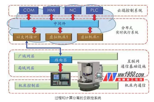 智能工廠(chǎng)的數控機床和機器人等智能裝備的未來(lái)發(fā)展重點(diǎn)已經(jīng)不在硬件,感知外部環(huán)境和工況變化需要更加強大的計算能力、通信帶寬和速度,才能進(jìn)行實(shí)時(shí)控制,形成真正的信息物理融合系統。它的特點(diǎn)是將設備的控制分為計算和過(guò)程兩部分,把運動(dòng)控制保留在本地,而將計算移到云端,在云端“克隆”相應的虛擬設備,在云端進(jìn)行虛擬制造,如圖所示。