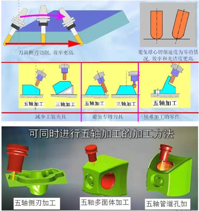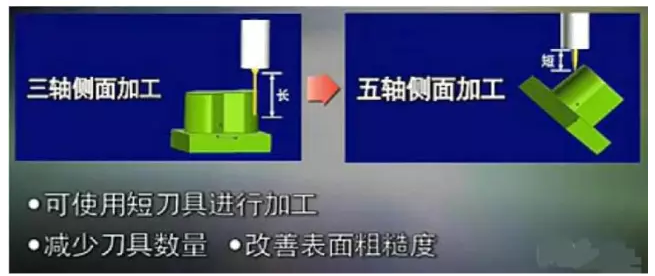 與三軸聯(lián)動(dòng)的數控加工相比,從工藝和編程的角度來(lái)看,對復雜曲面采用五軸數控加工有以下優(yōu)點(diǎn):